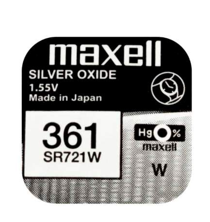 Maxell 361 är i storlek 7,9x2,15 mm. Spänning 1,55V.